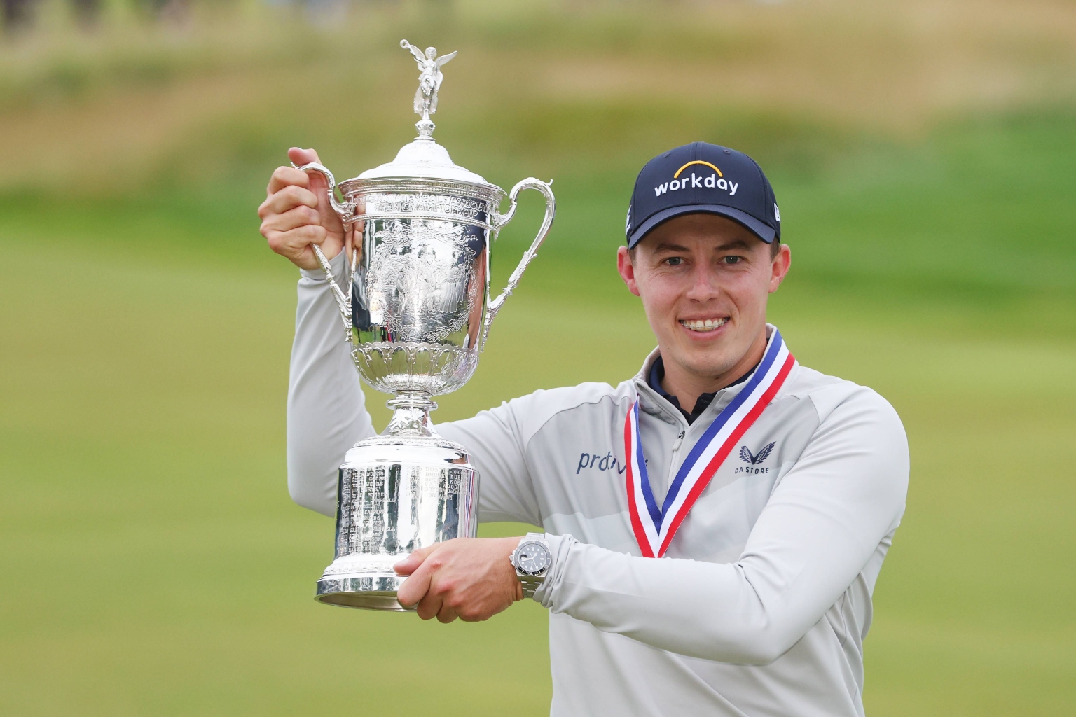 Matt Fitzpatrick celebrates with the US Open Championship trophy on June 19, 2022.