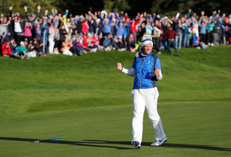 Team Europe's Suzann Pettersen celebrates winning her singles match against Team USA's Marina Alex at the Solheim Cup in Gleneagles, Britain, on Sept 15, 2019.
