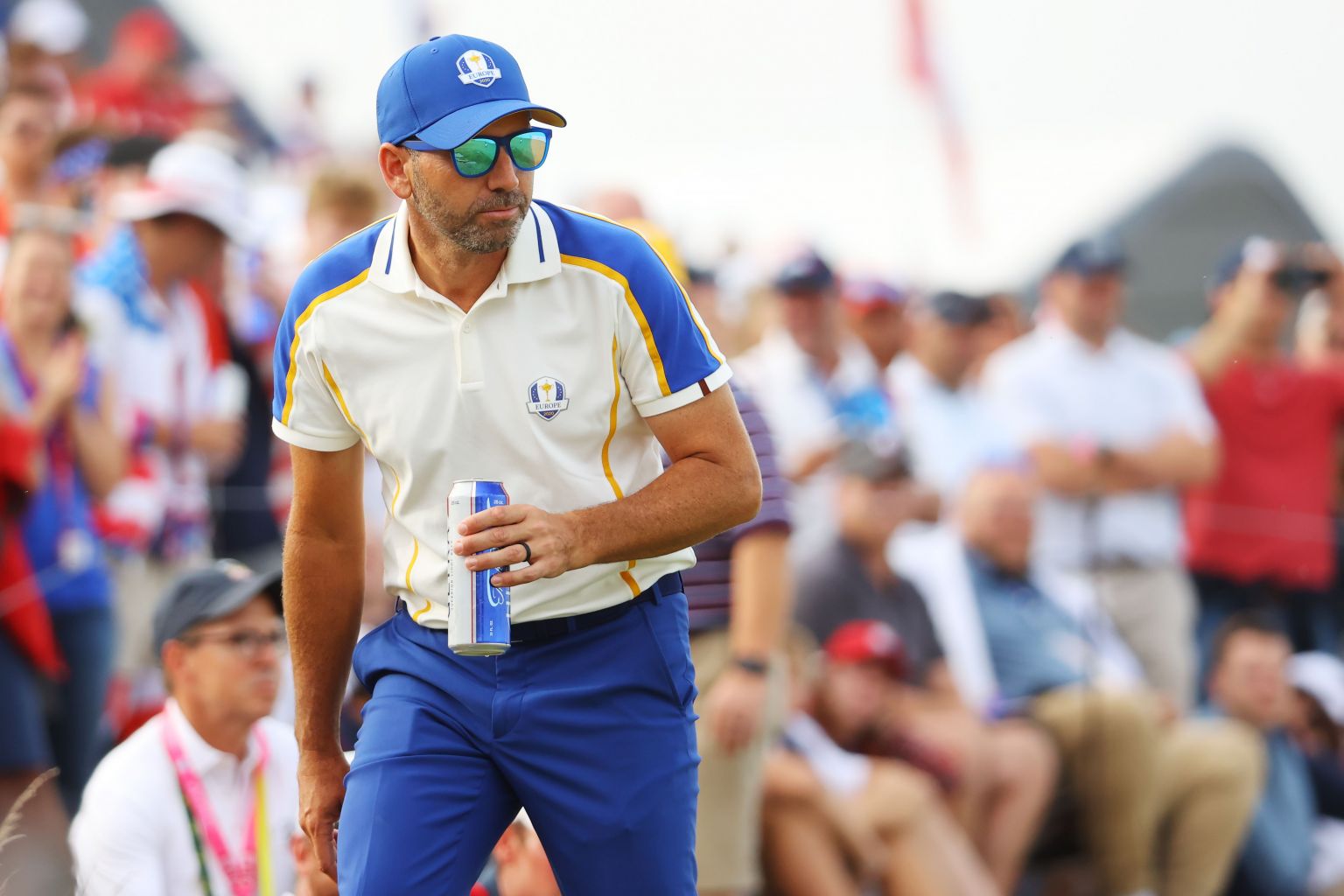 Team Europe's Sergio Garcia drinks a beer on the 17th hole during Sunday Singles Matches at the Ryder Cup.