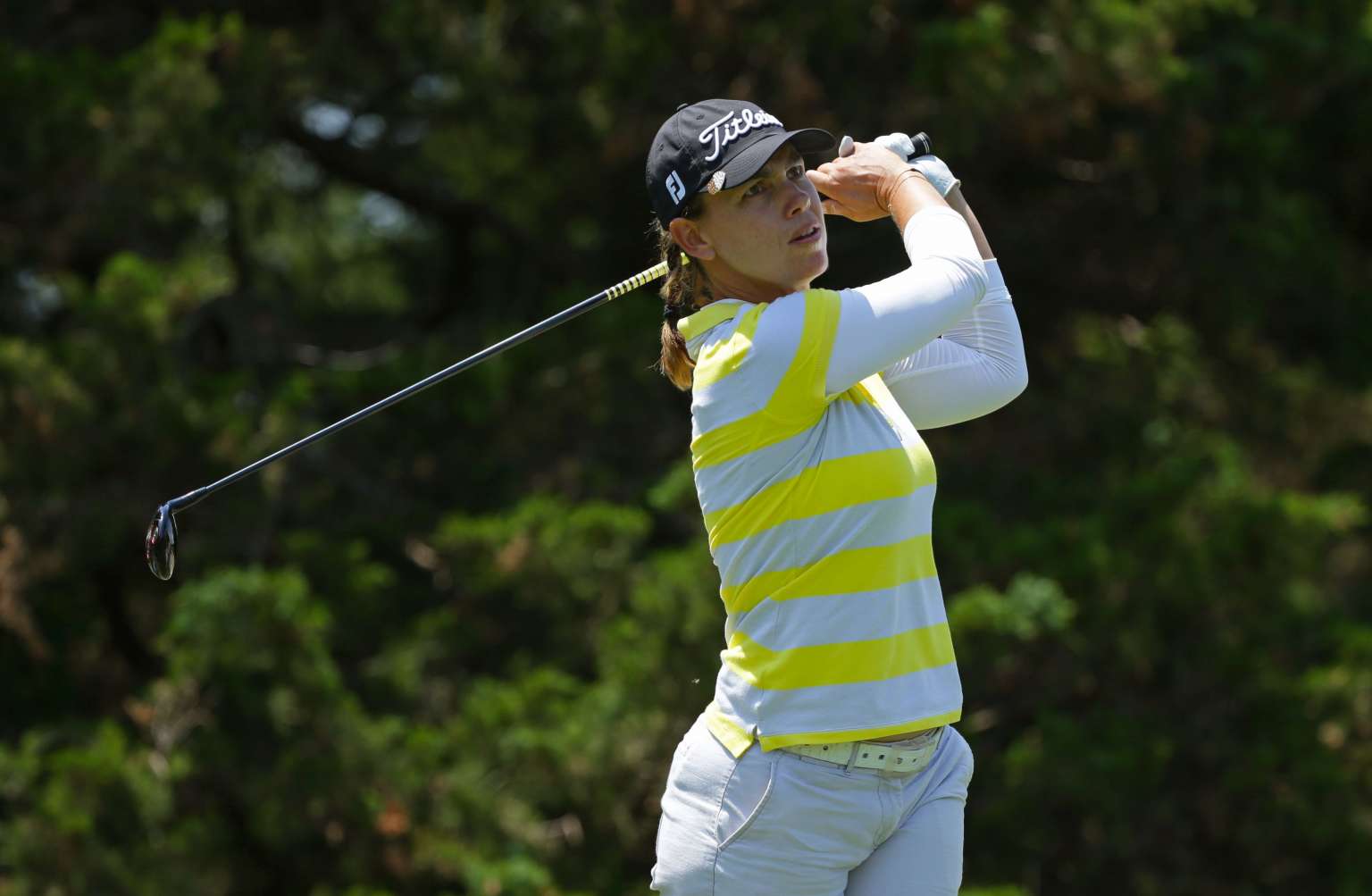 Karine Icher hitting her tee shot on the eighth hole during the second round of the ShopRite LPGA Classic in Galloway, New Jersey, on June 4, 2016.