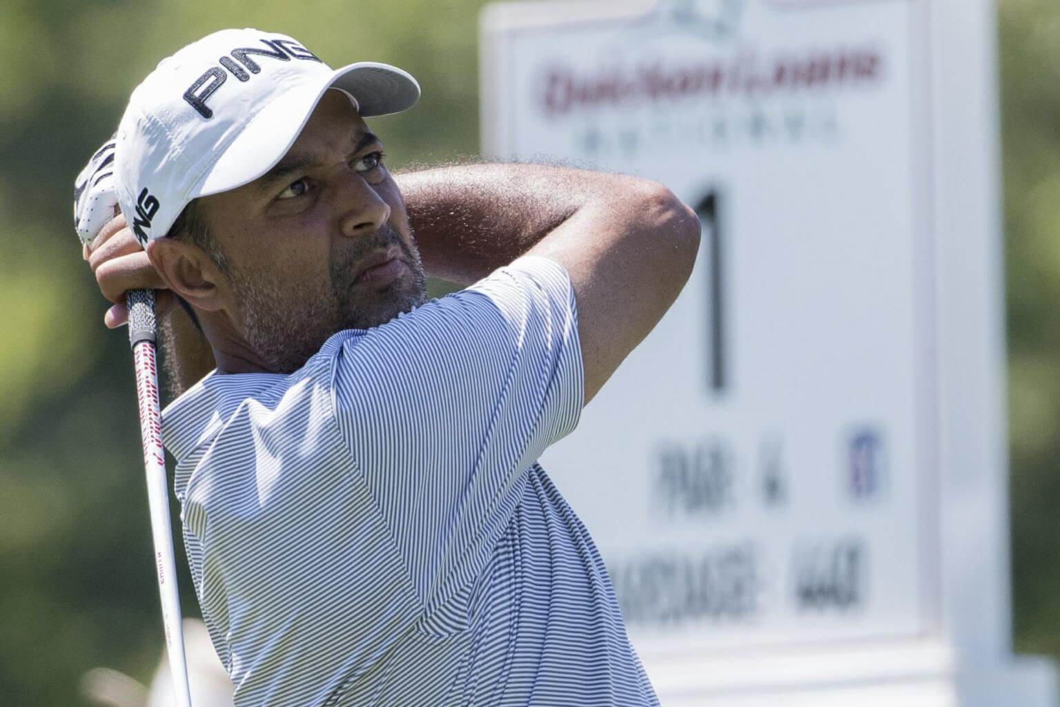 Arjun Atwal tees off on the 1st hole during the second round of the Quicken Loans National at TPC Potomac at Avenel Farms in Potomac, Maryland, USA, on June 30, 2017.