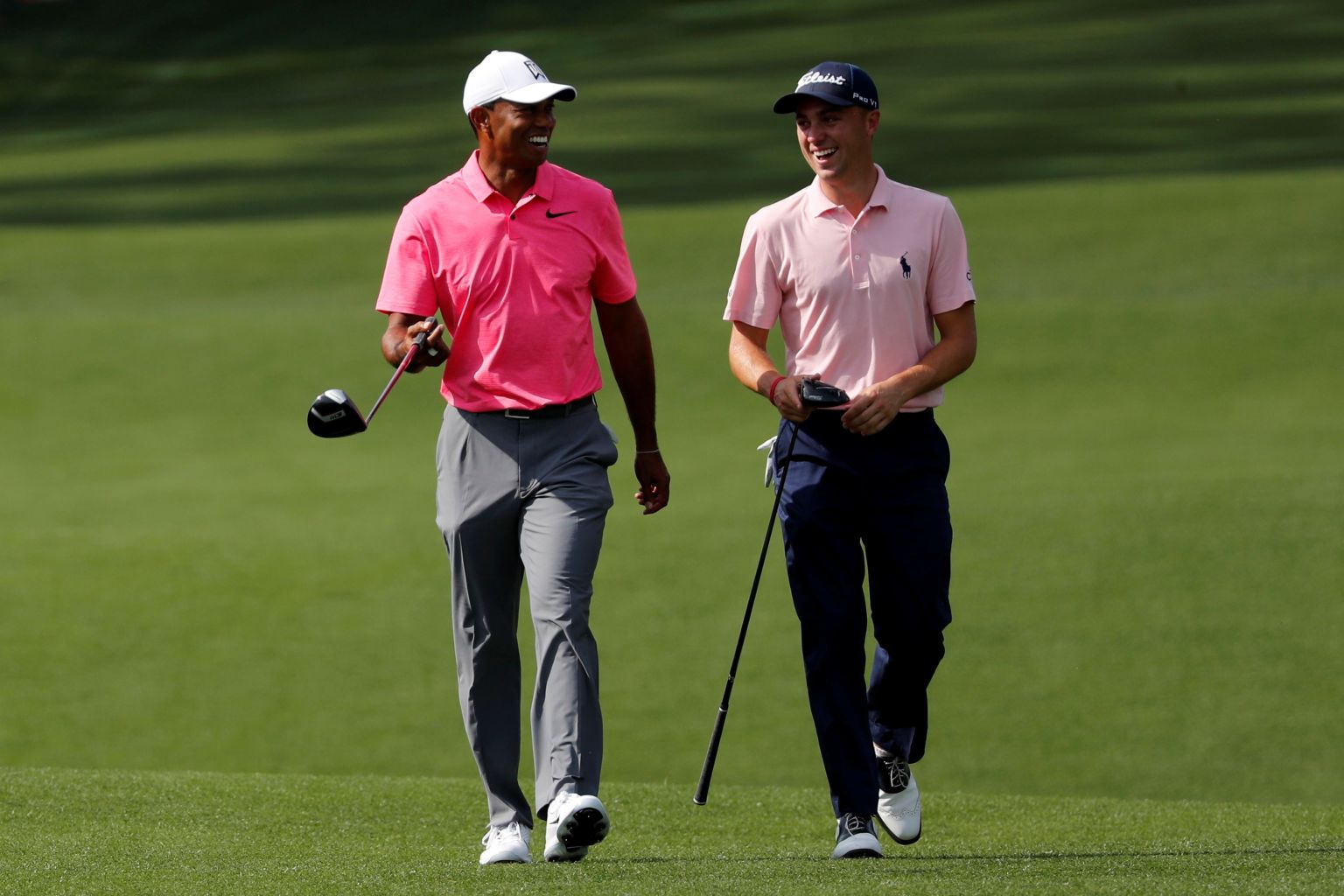 A 2018 photo shows Woods (left) and Thomas sharing a laugh during a Masters practice round in Augusta.
