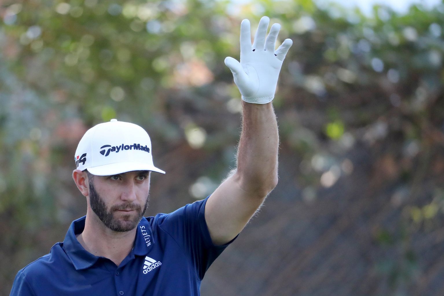 Dustin Johnson acknowledges fans on the 11th tee during the final round of the Genesis Open.