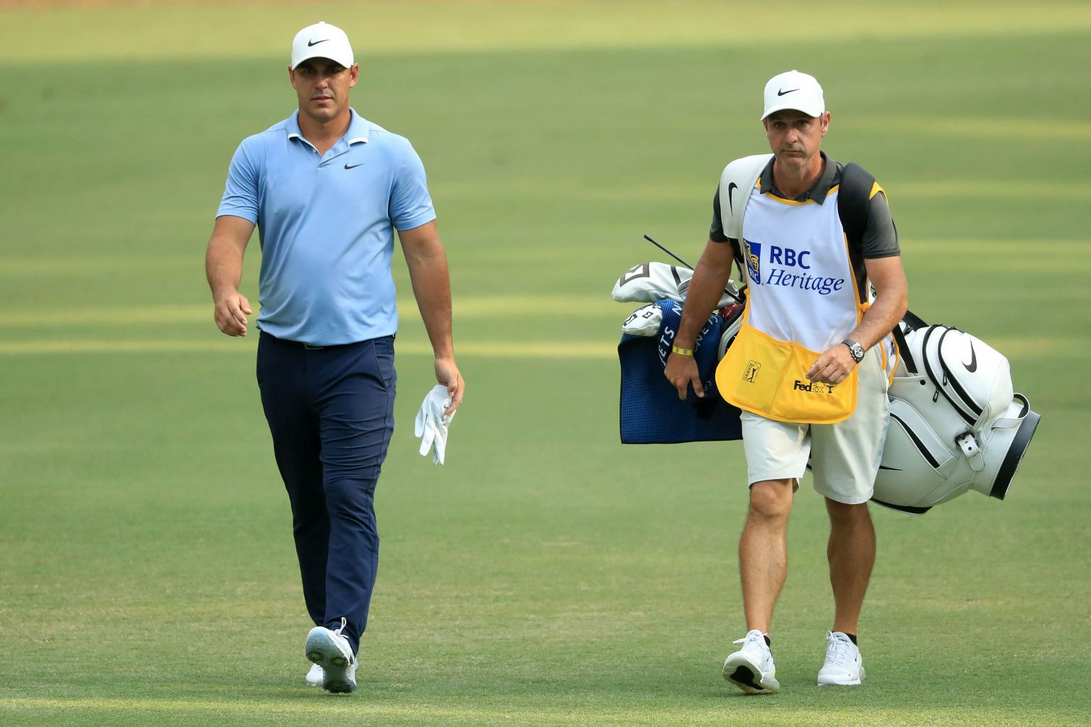 Koepka walks with caddie Ricky Elliott on the 15th hole during the final round of the RBC Heritage on June 21, 2020.