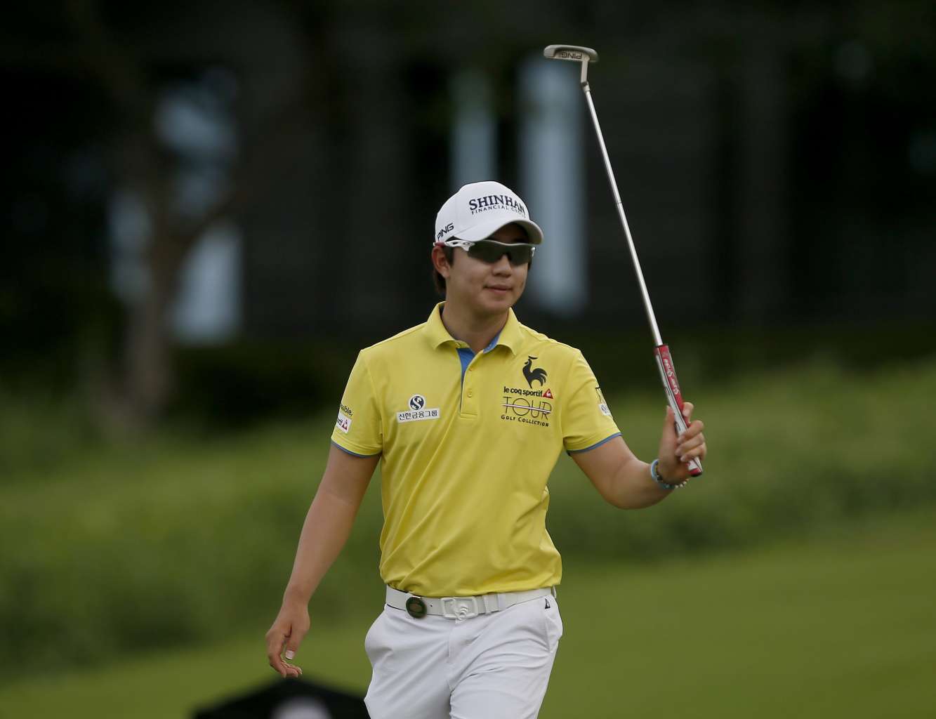 Song Young Han reacts after sinking a putt on Jan 30, 2016.