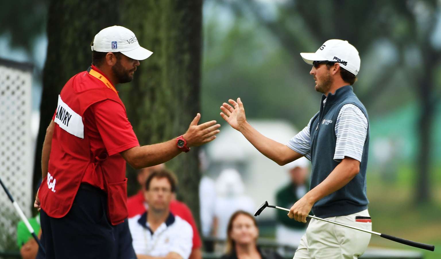 Landry shakes hands with his caddie Kevin Ensor prior to the start of play during the continuation of the weather delayed first round.