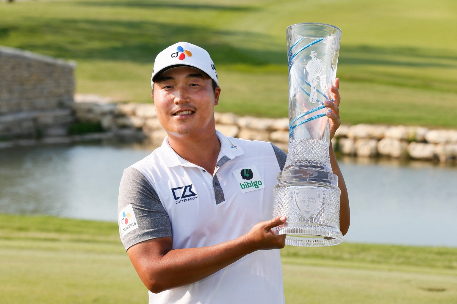 Byron Nelson champion K.H. Lee holds the winners trophy following the final round of the golf tournament.