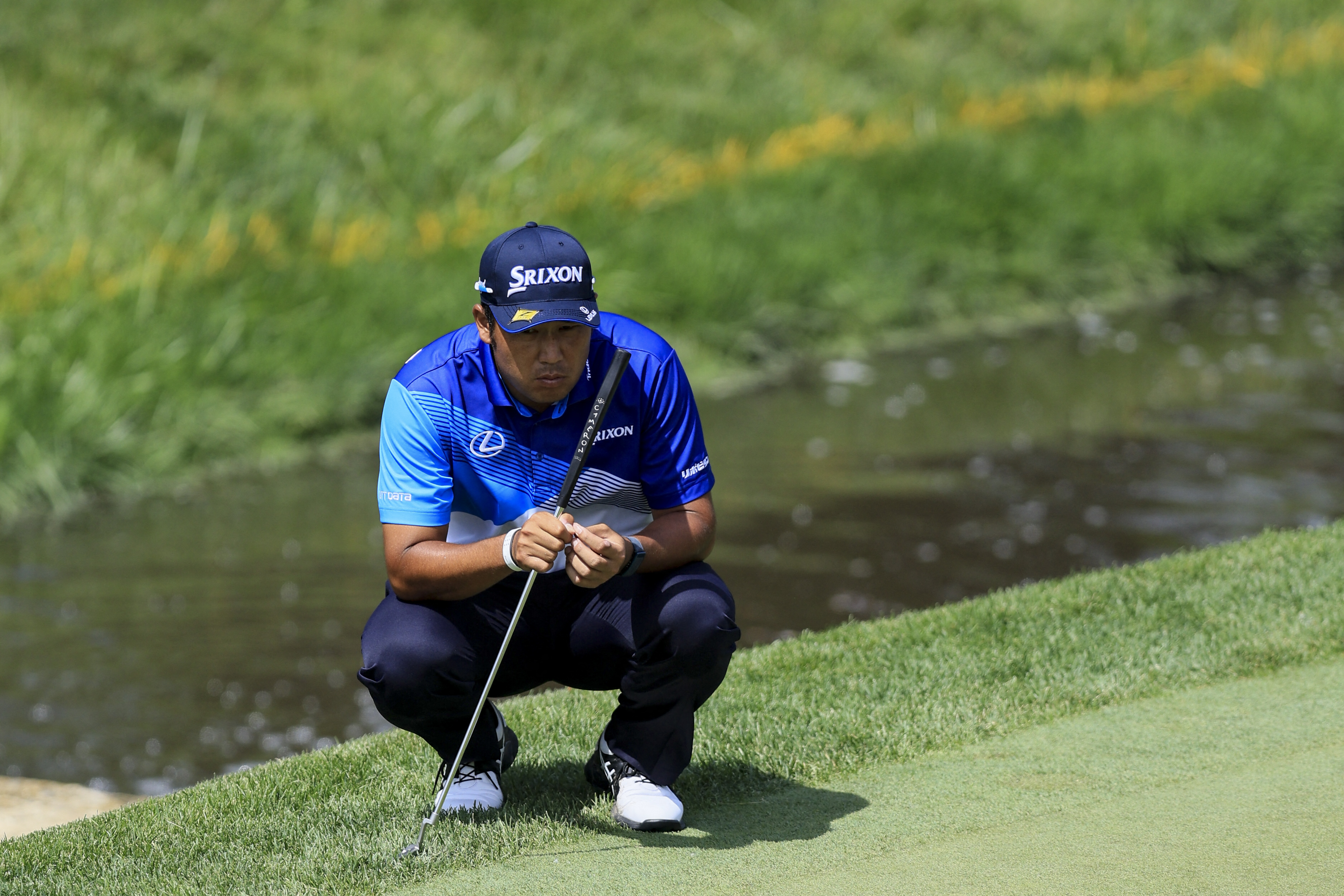 Hideki Matsuyama lines up a putt on the ninth green during the first round of the Memorial Tournament.