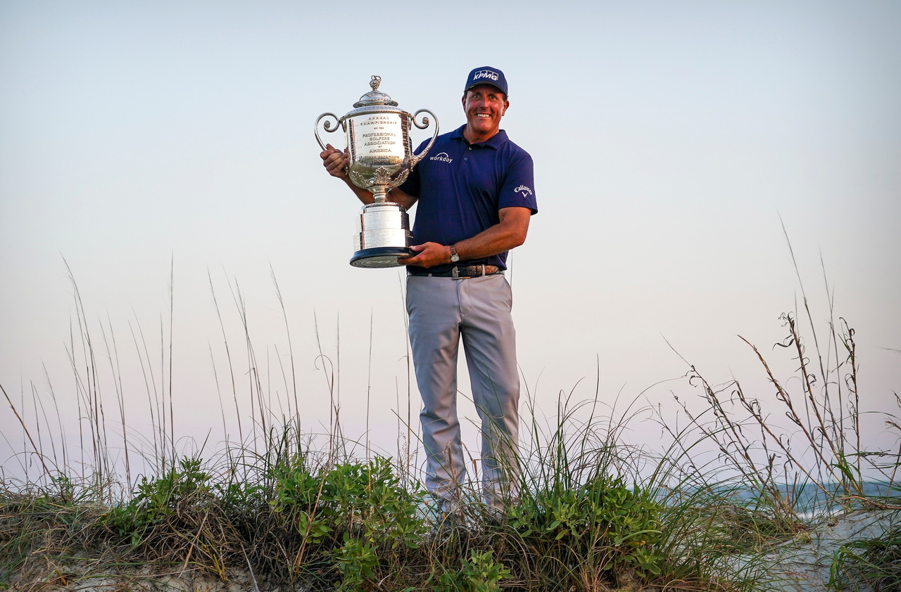 Phil Mickelson with the Wanamaker Trophy after winning the PGA Championship golf tournament in South Carolina, on May 23, 2021.