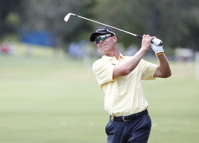 John Senden plays an iron during play on the first day of the Pro-Am of the Australian PGA Championships at the Royal Pines Resort on the Gold Coast, Australia, on Nov 29, 2018.