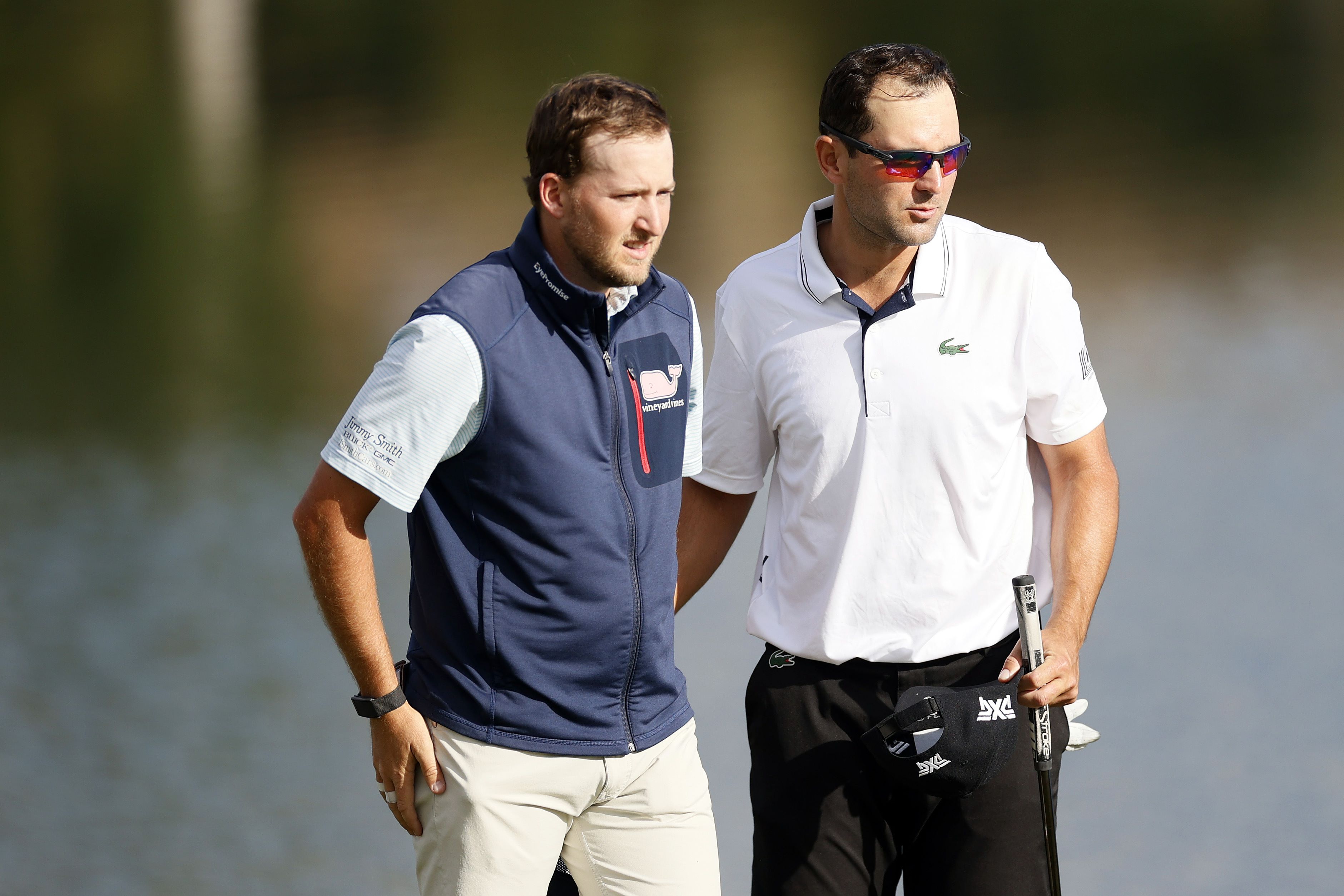 Lee Hodges (left) and Paul Barjon talk after the 18th hole during the second round of The American Express on Jan 21, 2022.