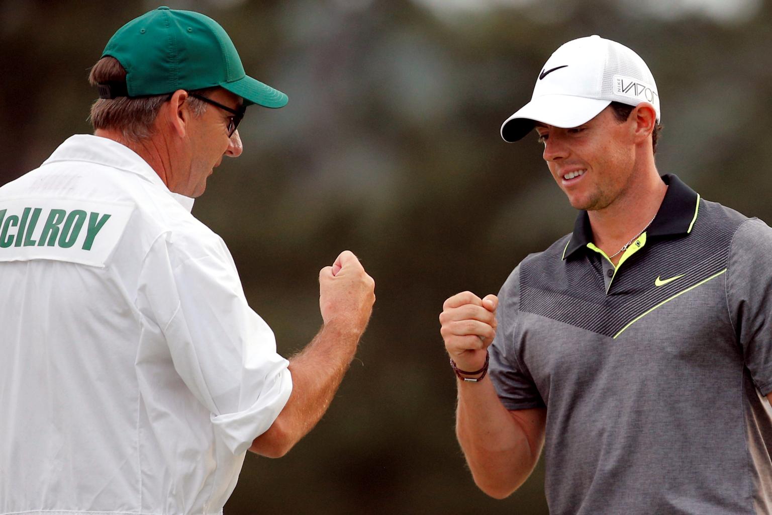 Rory McIlroy fists with his caddie J.P. Fitzgerald at the Augusta National Golf Course on April 10, 2015.