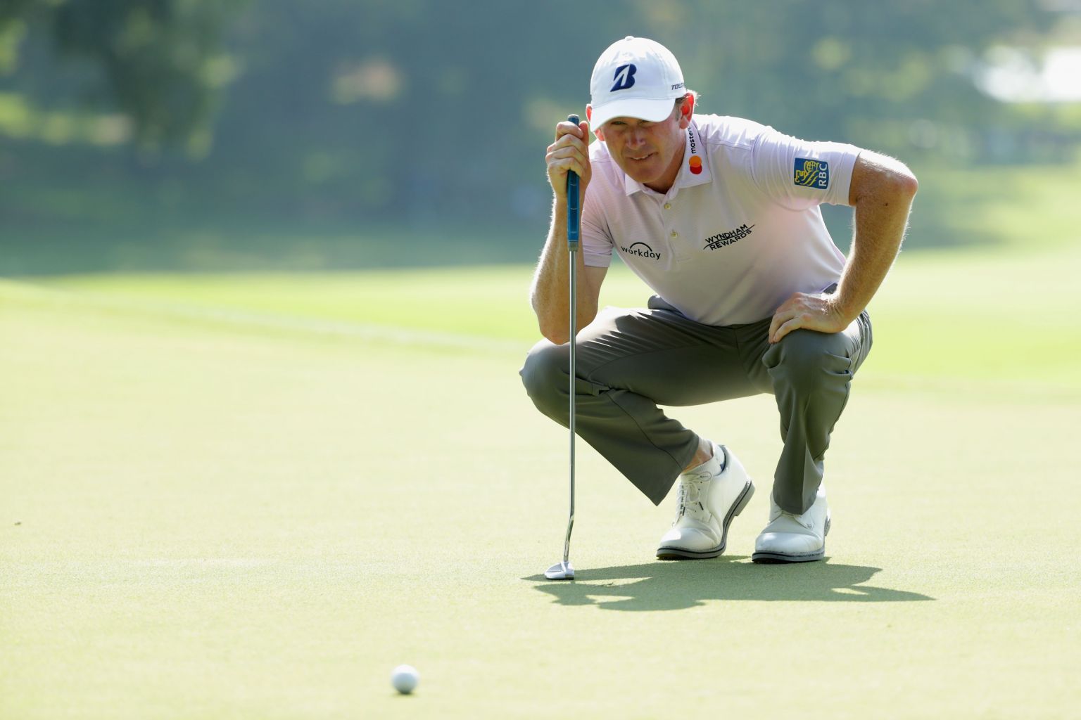 Snedeker lines up a putt on the first green during the first round of the Wyndham Championship.