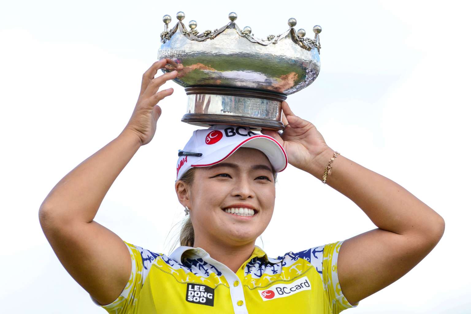 Jang Ha Na of South Korea poses with the winner's trophy after winning the Australian Open golf tournament at the Royal Adelaide Golf Club in South Australia on Feb 19, 2017.