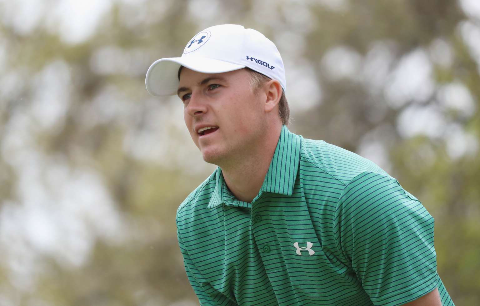 Spieth reacts to his tee shot on the 12th hole.