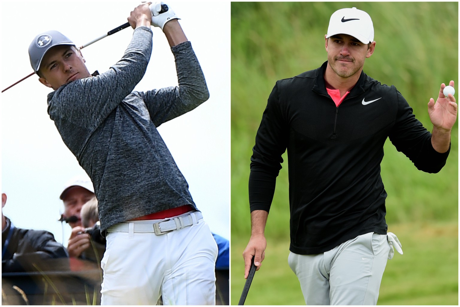 Jordan Spieth (left) and Brooks Koepka are the early leaders in the first round of the British Open with 65s.