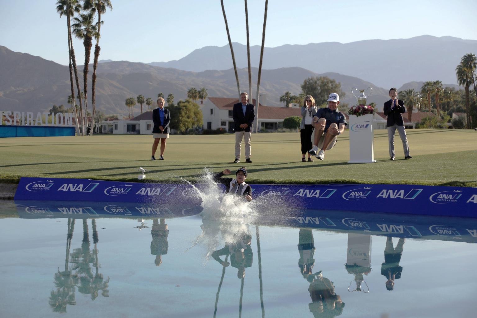 Patty Tavatanakit and her caddie Grant Waite celebrate by jumping into Poppie's Pond at Mission Hills Country Club.