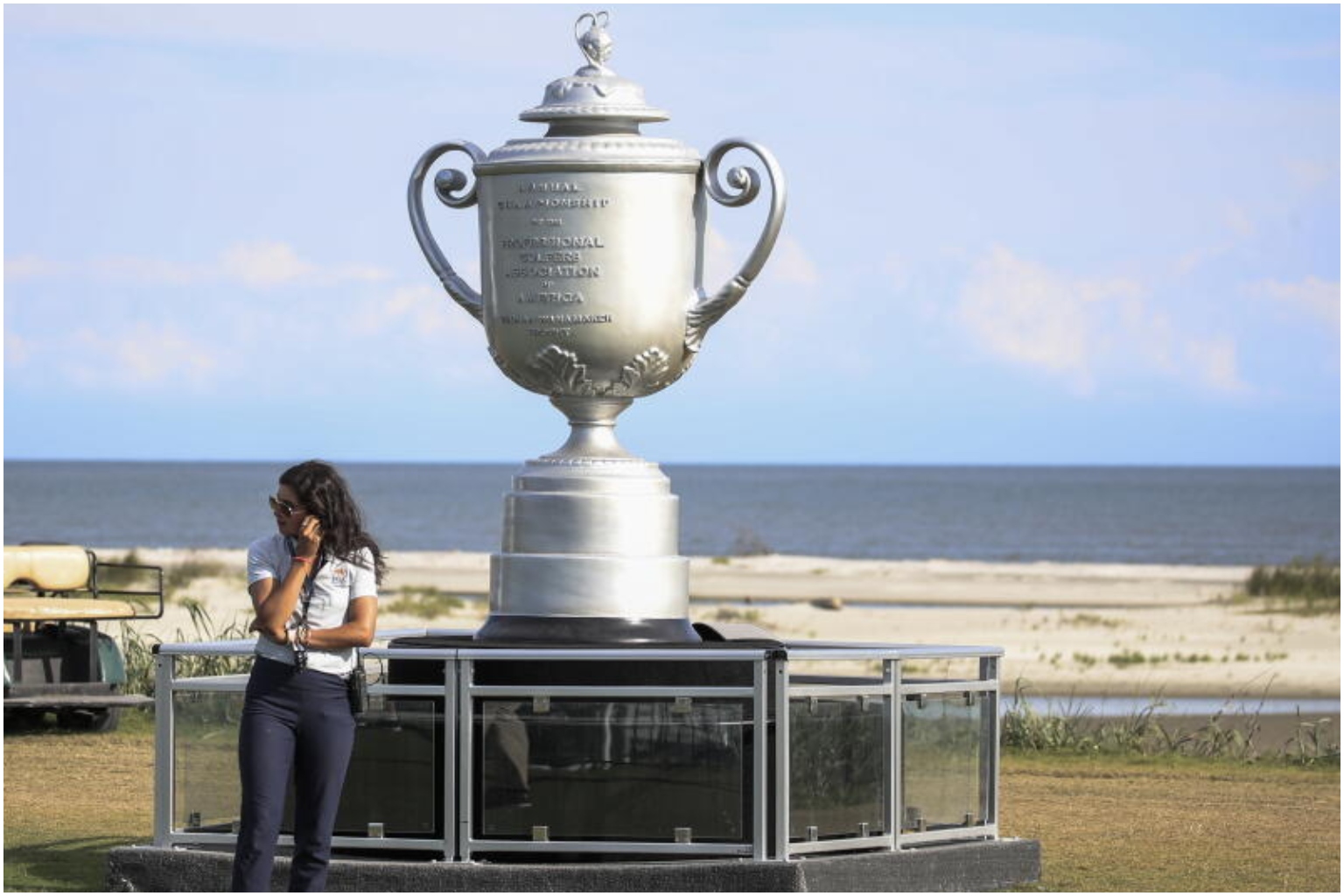 A woman stands next to a large replica of the PGA Championship Wanamaker Trophy on the Ocean Course at Kiawah Island, South Carolina, on May 17, 2021.