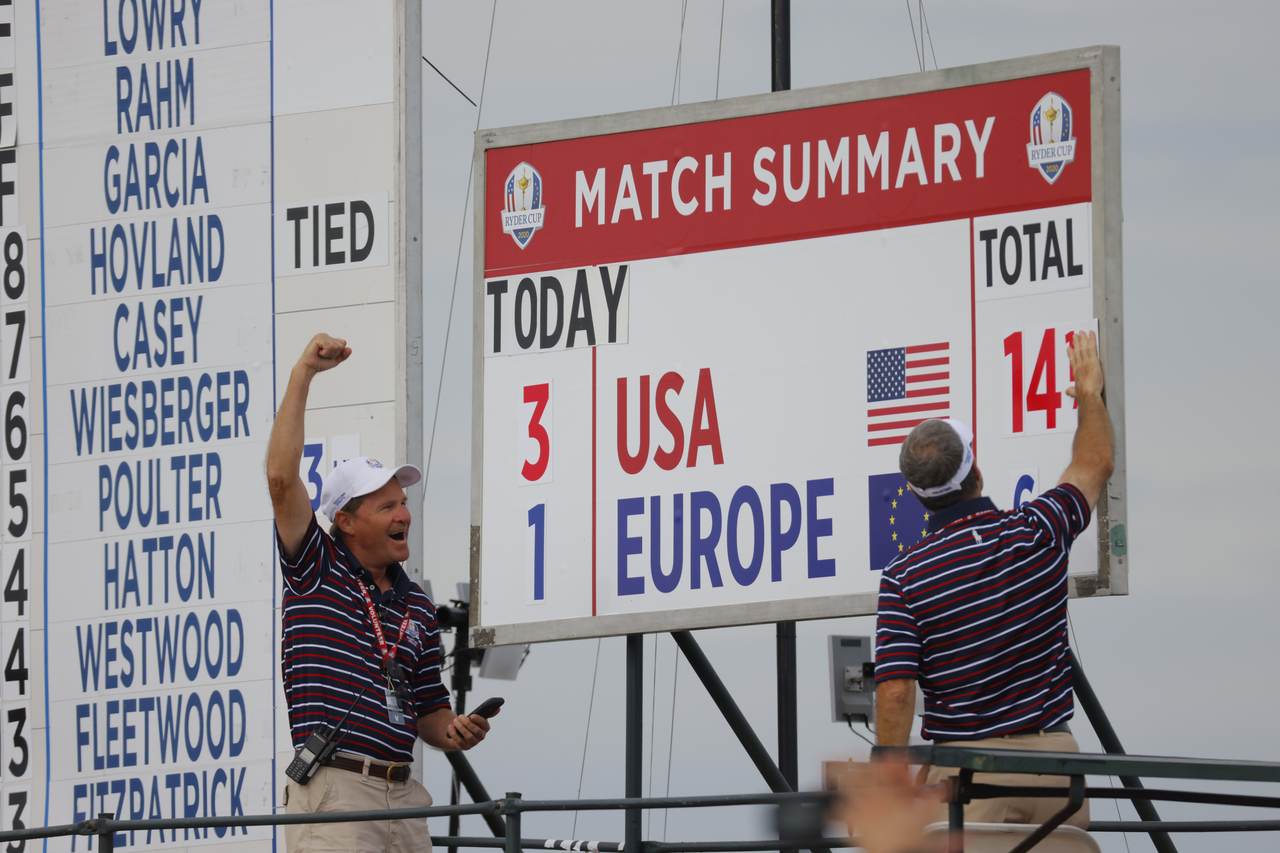 Members of staff celebrate by the scoreboard after Team USA win the Ryder Cup.