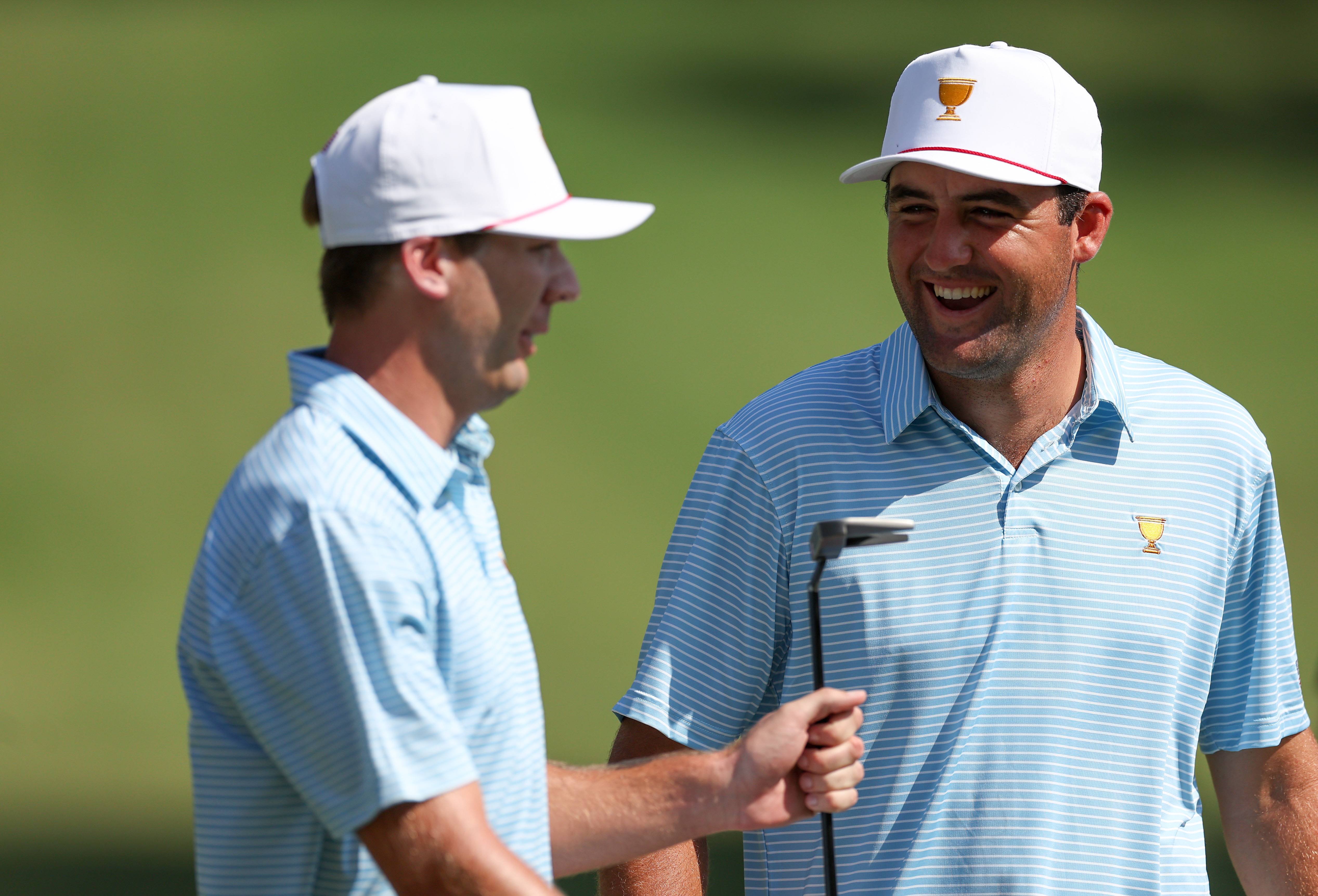 Sam Burns (left) and Scottie Scheffler, of the United States Team, celebrate after winning the sixth hole, during the Thursday foursome matches on day one.