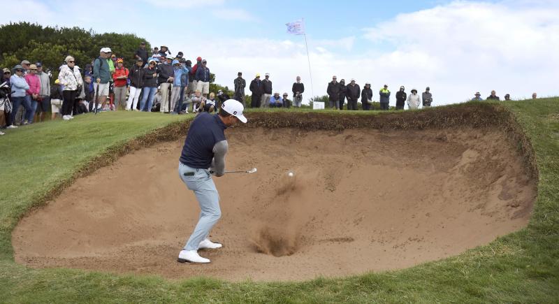 Wade Ormsby of Australia hits out of a bunker during the third round of the at the Vic Open in Barwon Heads, Australia, on Feb 9, 2019.