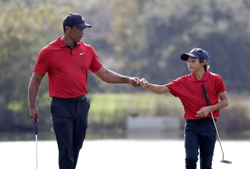 Tiger Woods and his son Charlie on the 12th hole the during second round.