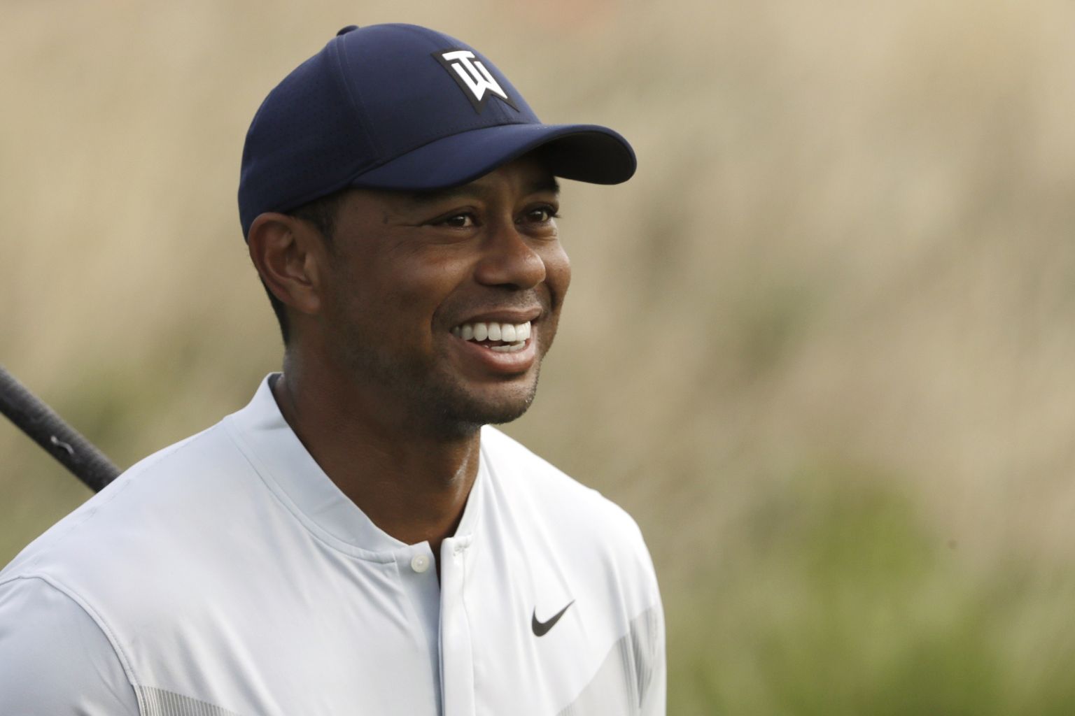 Woods smiles after teeing off on the 12th hole in the Northern Trust tournament.