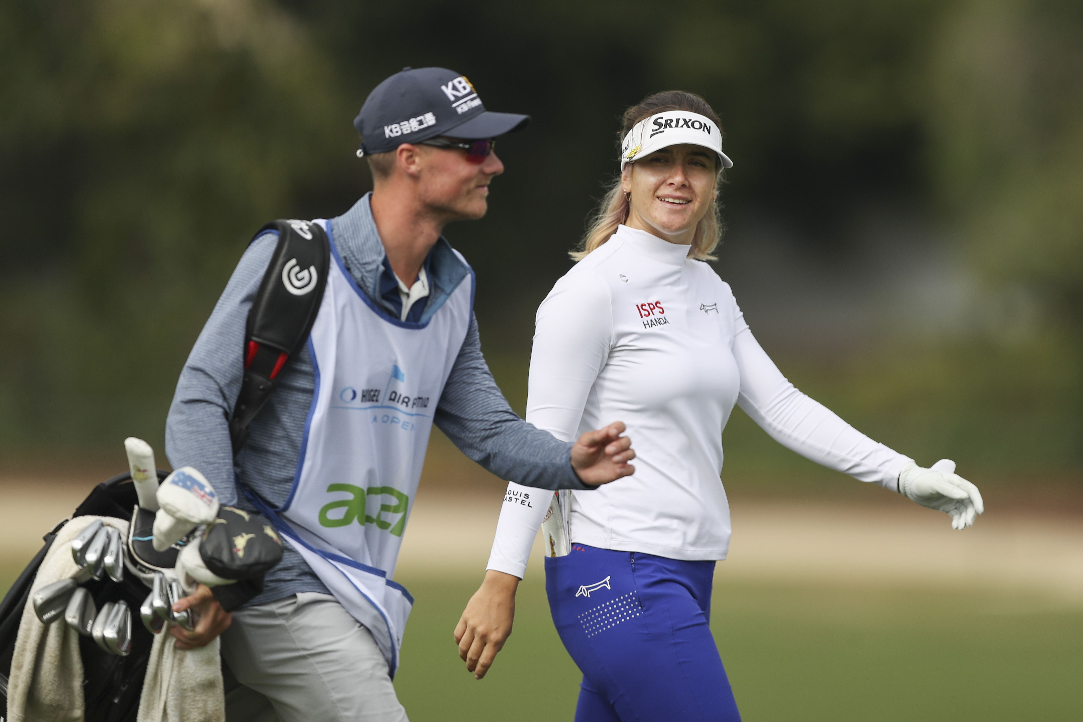 Hannah Green walks with her caddie down the 13th fairway at the LA Open on April 23, 2021.
