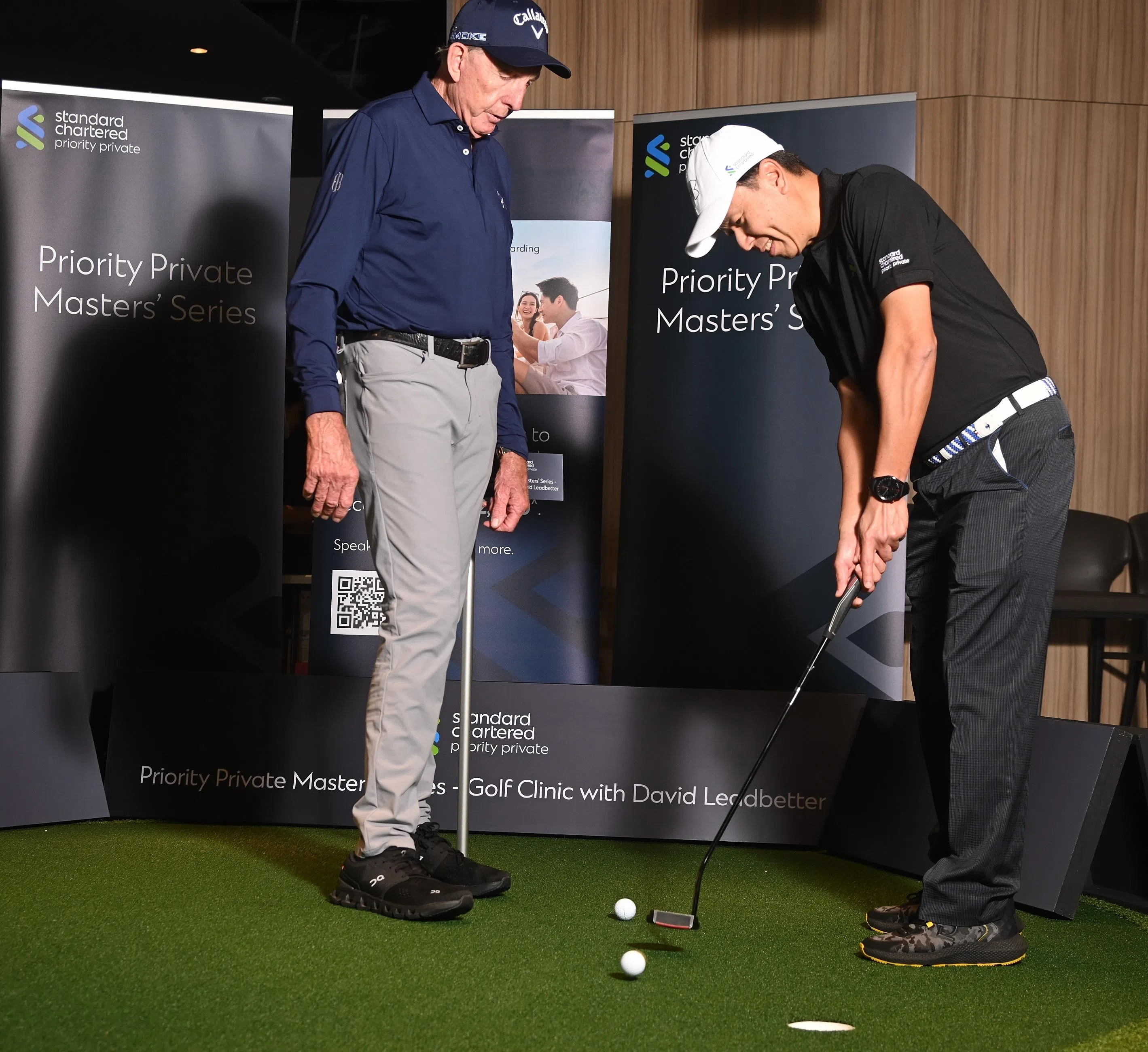 David Leadbetter (left) conducting a closed-door golf clinic organised by Standard Chartered Bank at Marina Square on Oct 25.