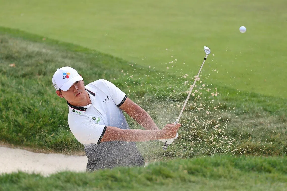 South Korea’s Kim Si-Woo plays a shot from a bunker on the 16th hole, during the third round.