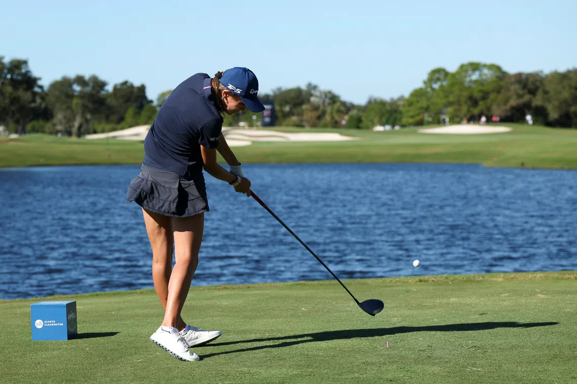 Kai Trump teeing off on the 16th hole during the first round of The Annika golf tournament at Pelican Golf Club.