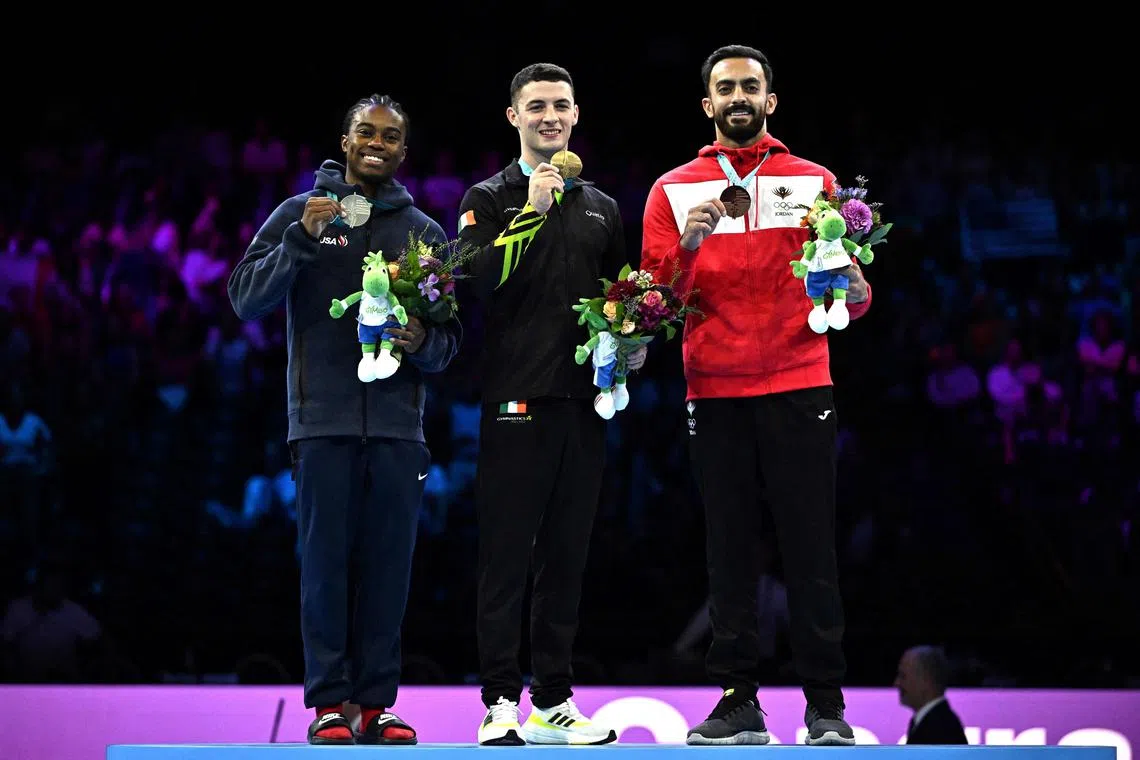 (From left) Khoi Young, Rhys McClenaghan and Ahmad Abu Al Soud on the podium after the men’s pommel horse final.