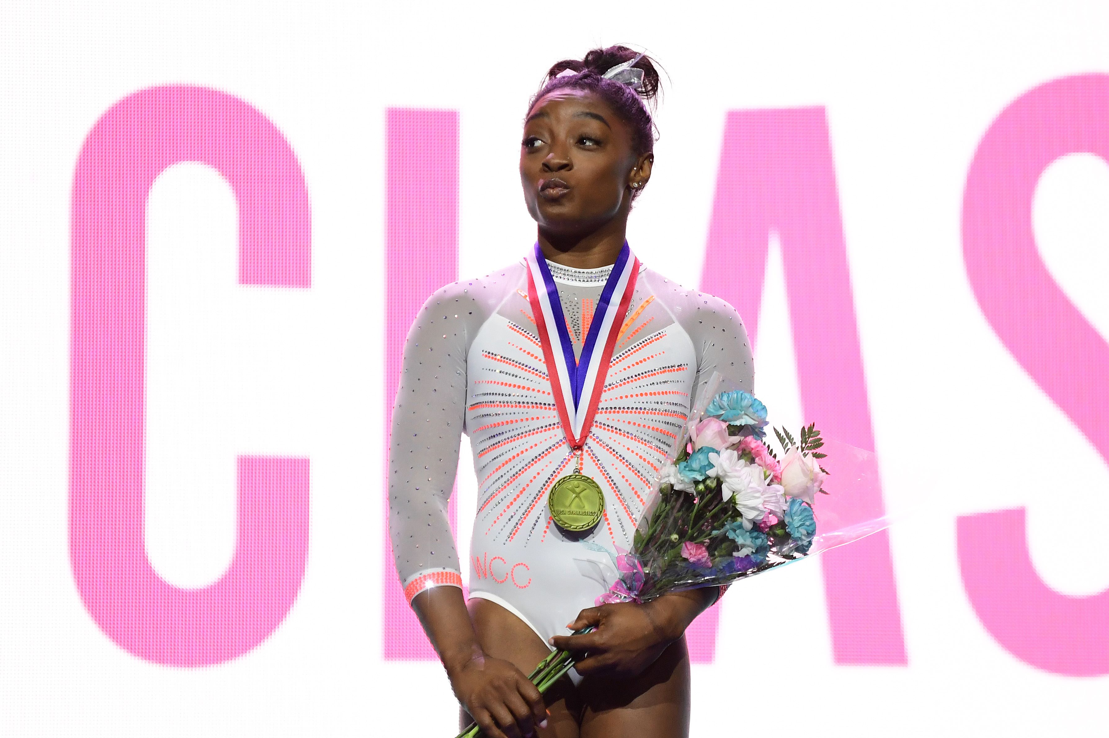 "I'm just happy to be back out here on the competition floor in an arena with all of the girls, especially after the long year and time off we've had," Biles said.