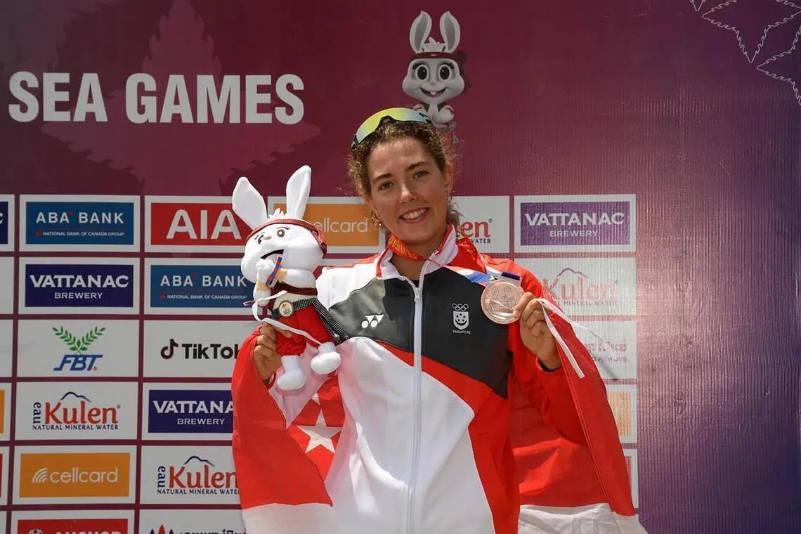 Singapore’s Louisa Middleditch posing with her bronze medal in the women's triathlon at the 2023 SEA Games. PHOTO:SNOC