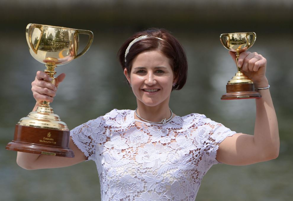 Australian jockey Michelle Payne posing with the winner's trophy on Nov 4, 2015.