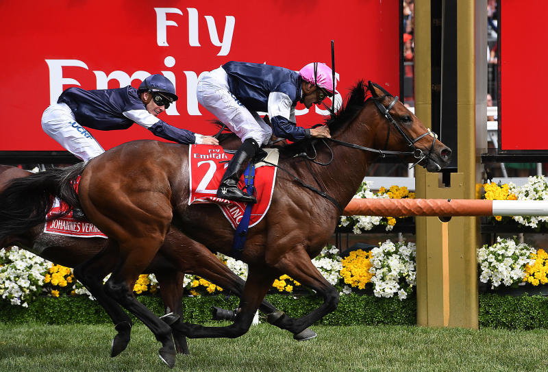 Rekindling, ridden by Corey Brown, wins the 157th version of the Melbourne Cup ahead of second-placed Johannes Vermeer at Flemington racecourse in Melbourne.