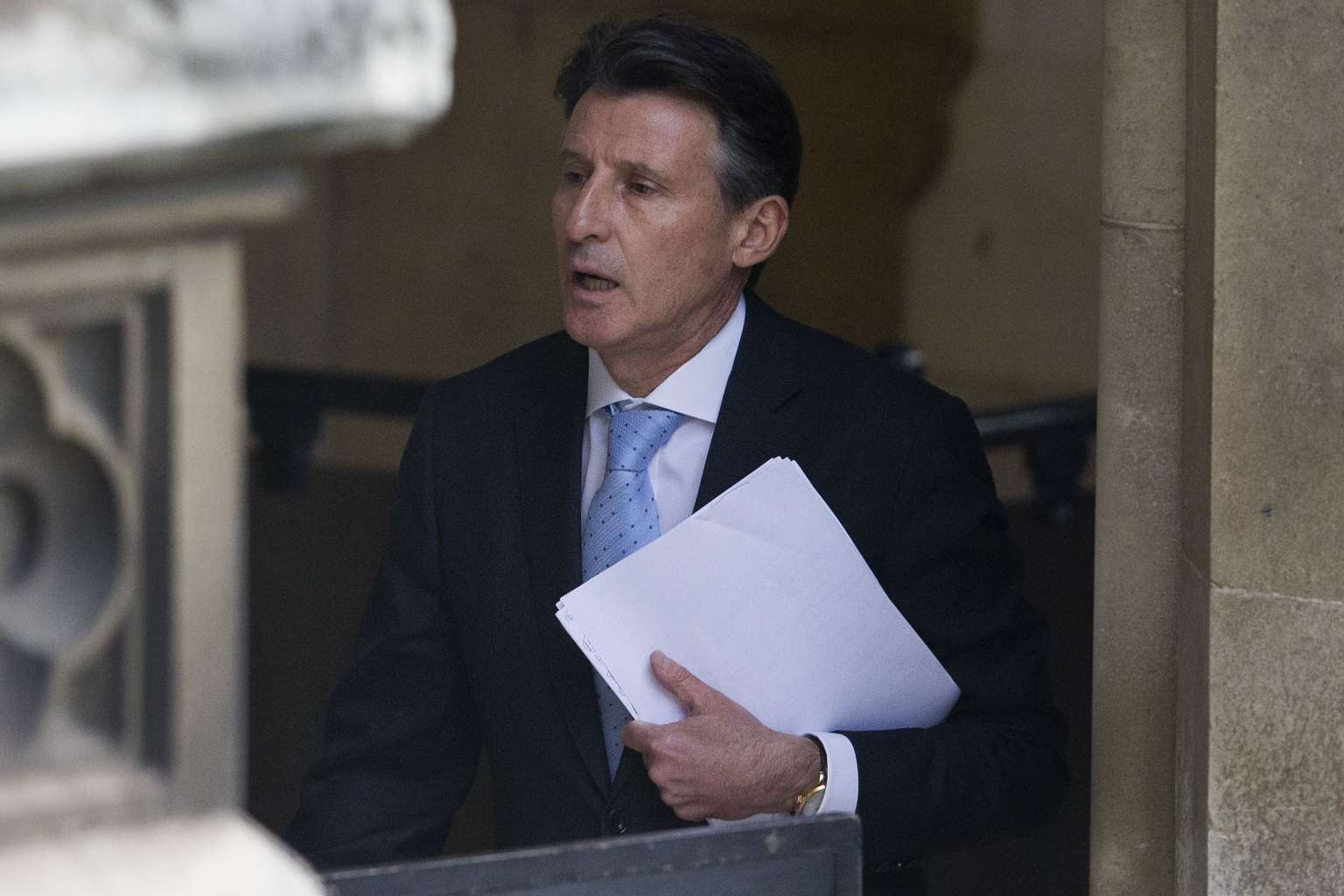 IAAF president Sebastian Coe arrives at the Houses of Parliament in London.