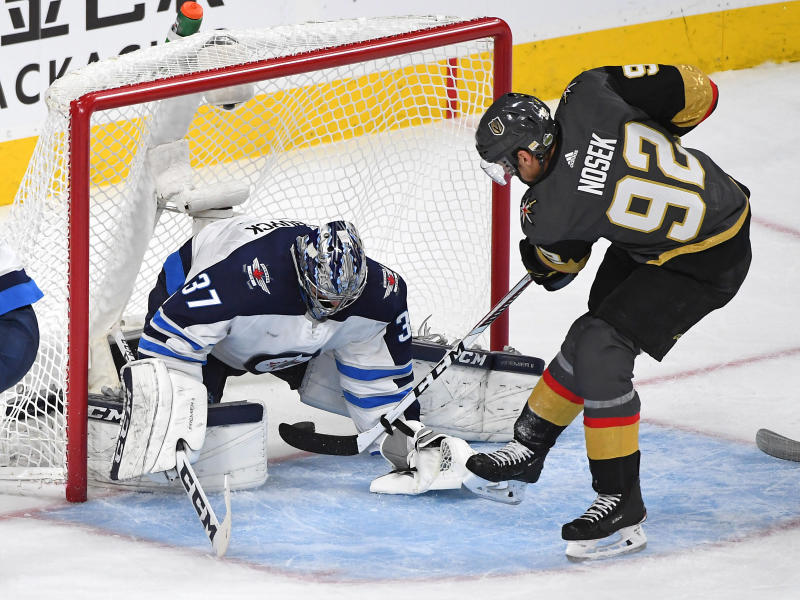 Vegas Golden Knights left wing Tomas Nosek (right) scores a goal past Winnipeg Jets goaltender Connor Hellebuyck in game four of the Western Conference Final of the 2018 Stanley Cup Playoffs.
