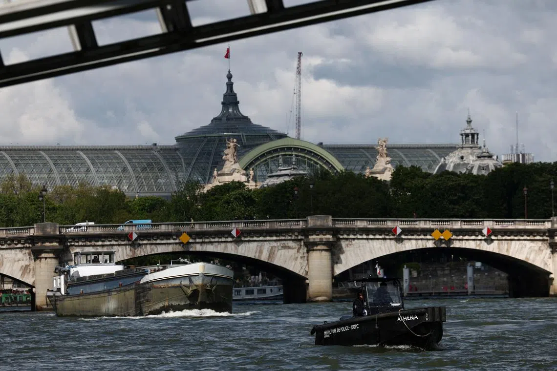 A police boat patrols on the River Seine near the Grand Palais, 100 days before the start of the Paris Olympic Games in France, on April 17, 2024.