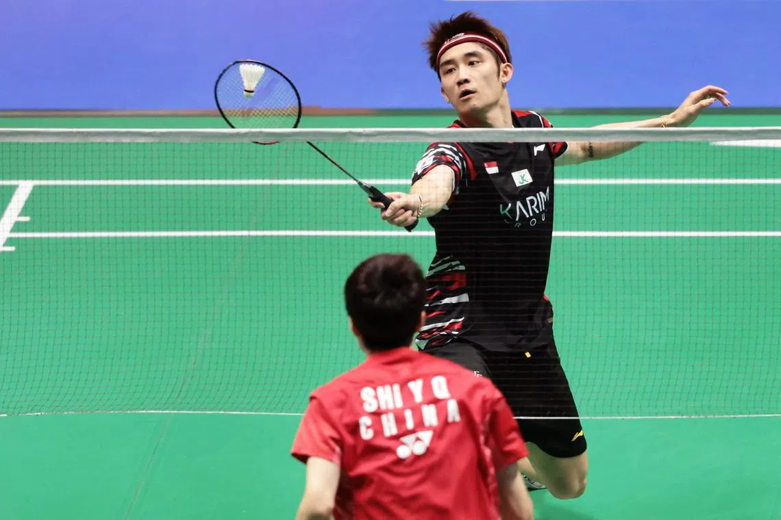 Singapore’s Jason Teh returning to China’s Shi Yuqi during their first round match on May 27.