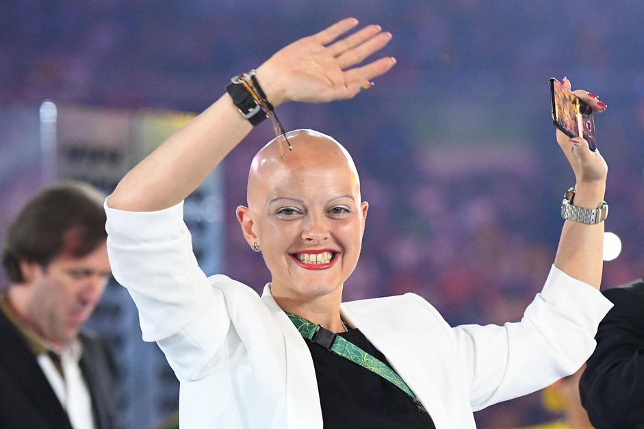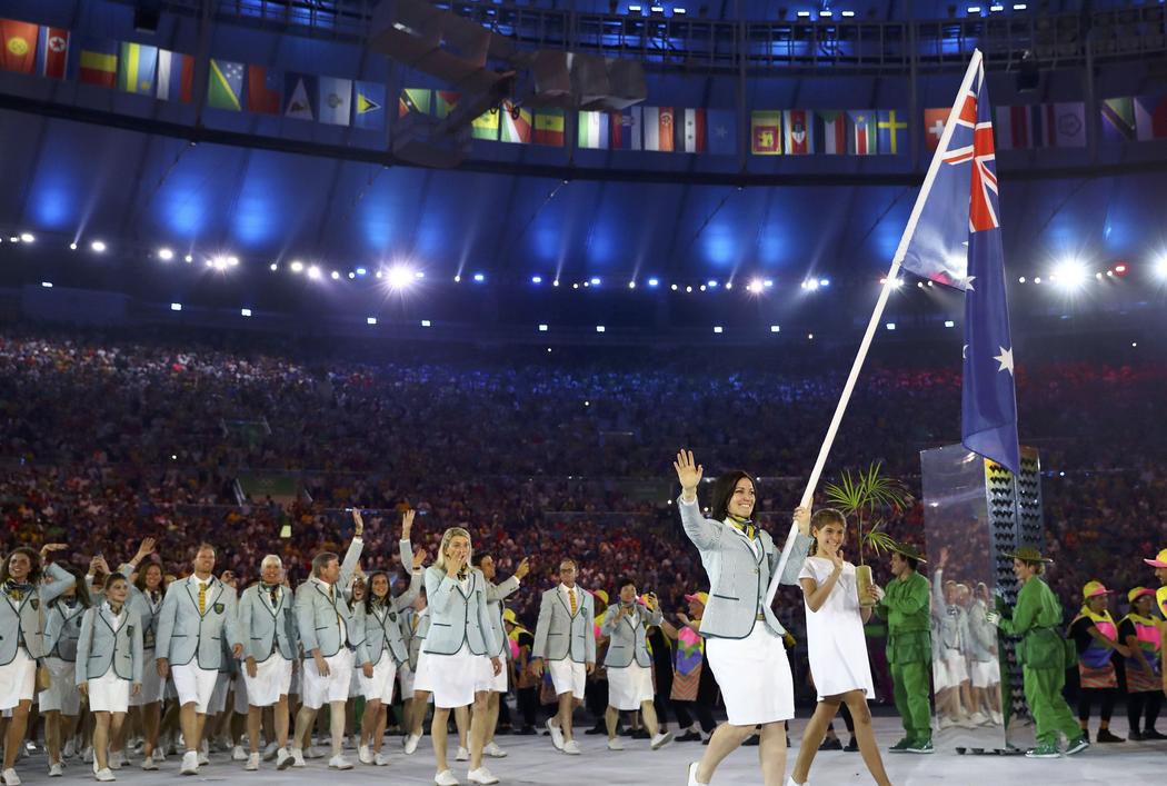 Flagbearer Anna Meares of Australia arrives for the opening ceremony.