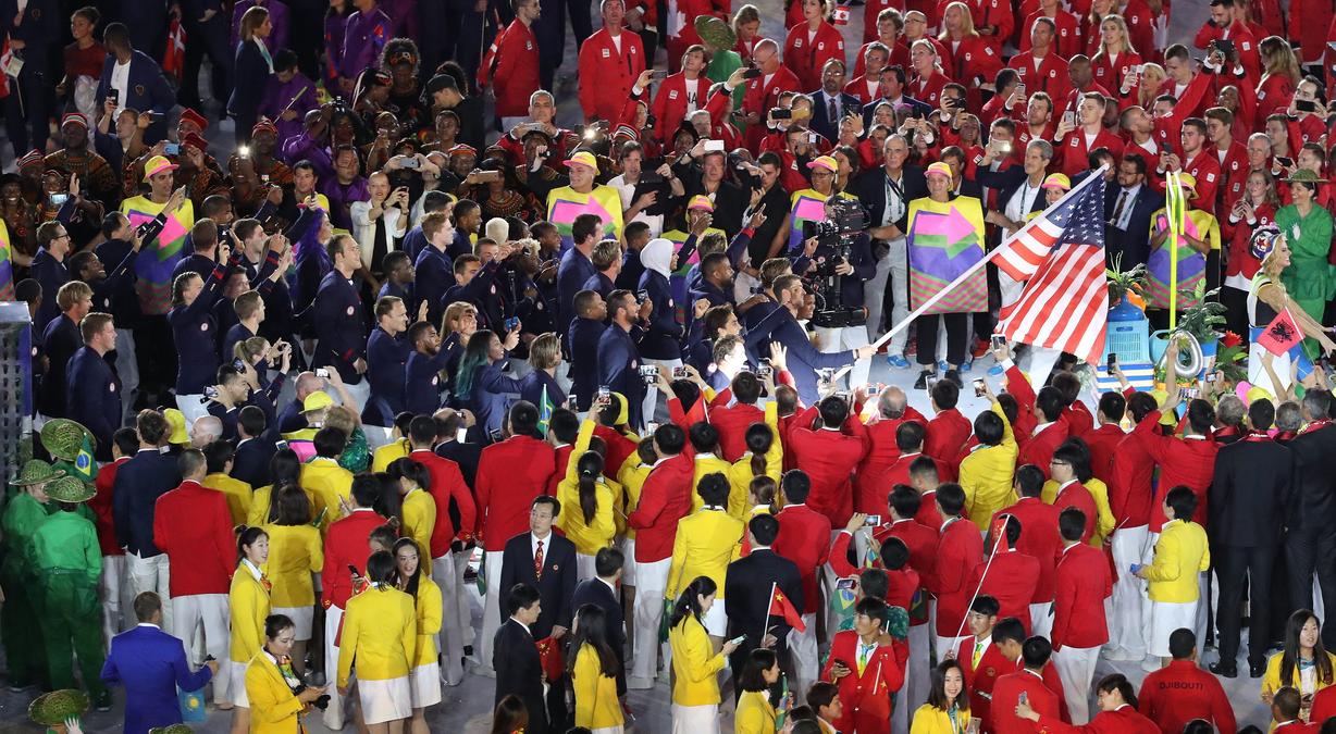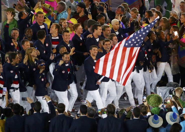 The US team led by flagbearer Michael Phelps arrives during the Opening Ceremony.