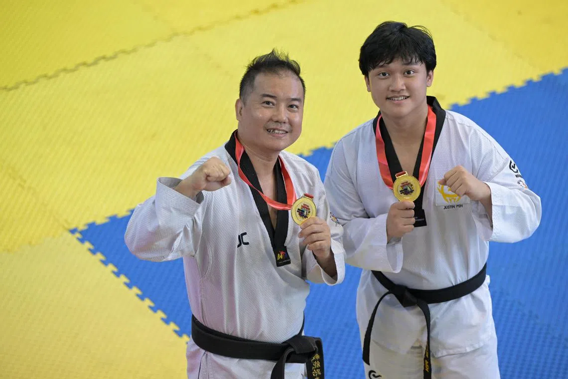 Father and son duo, Brian Peh and Justin Peh, who took home the gold in the mixed masters and individual male categories respectively at the inaugural Singapore Open Virtual Taekwondo Championships on June 9, 2024.