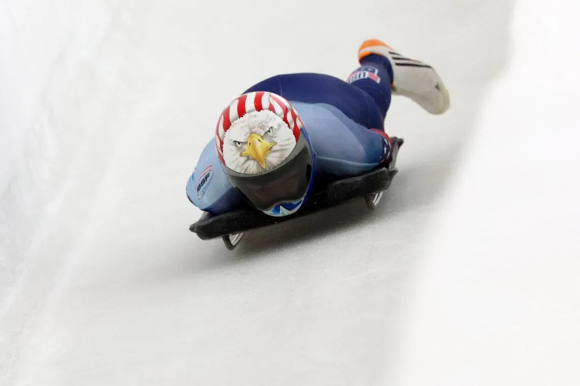 Katie Uhlaender of the US competing in the women's skeleton at the Bobsleigh and Skeleton IBSF World Championships, in New York, on March 7, 2025.