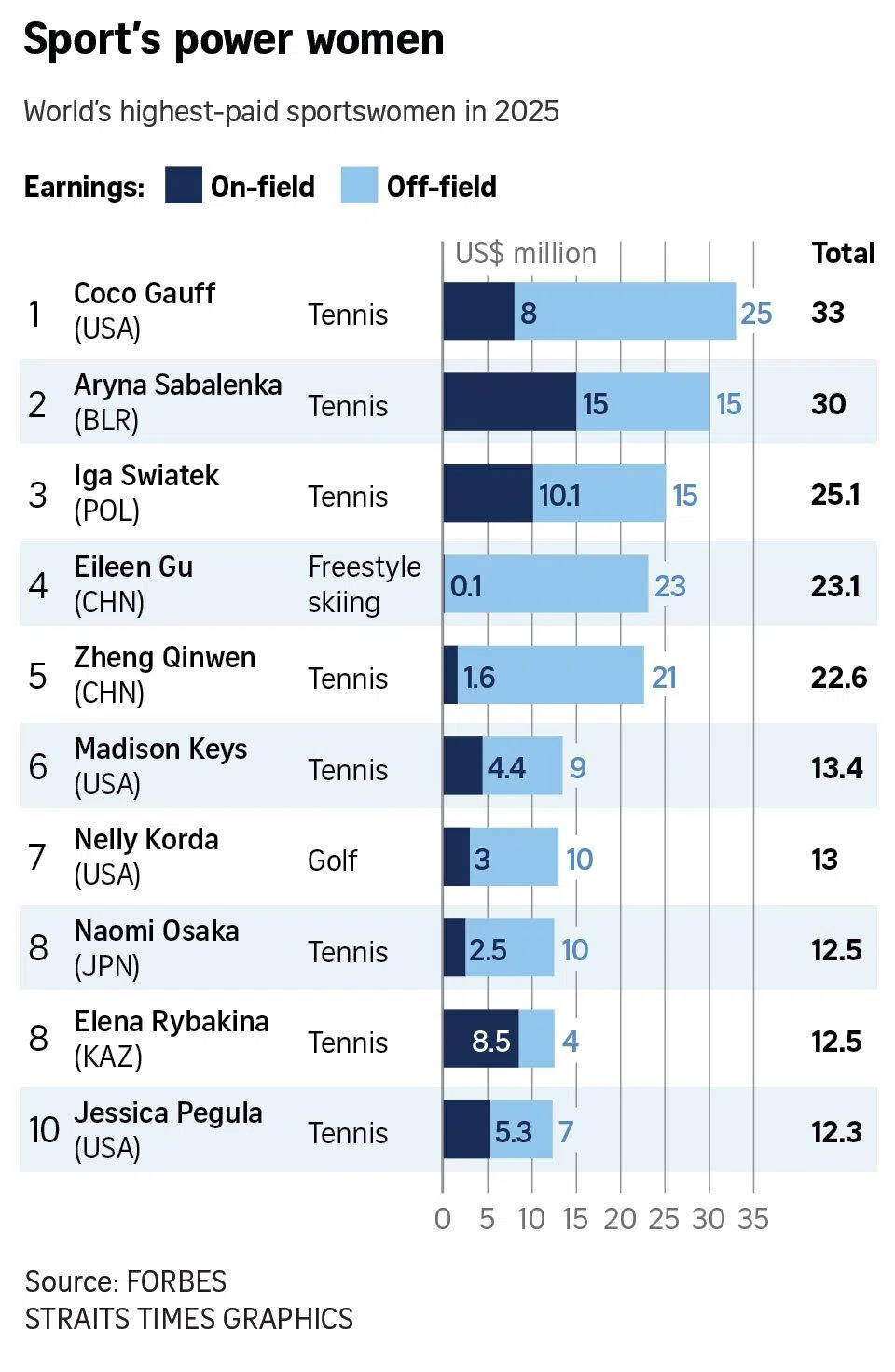 Ten of the 20 athletes on the list were tennis players, including table-topper Coco Gauff (US$33 million), who led a quintet including Aryna Sabalenka (US$30 million), Iga Swiatek (US$25.1 million), Zheng Qinwen ($22.6 million) and Madison Keys (US$13.4 million) in occupying five of the top six positions.