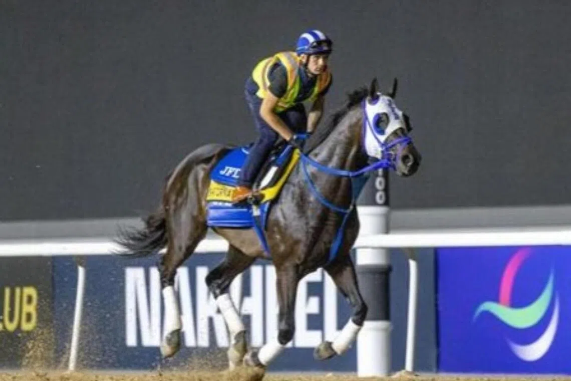 US raider Bentornato taking a spin around Meydan as he receives the last finishing touches ahead of his assignment in the Group 1 Dubai Golden Shaheen (1,200m) at Meydan on March 28.