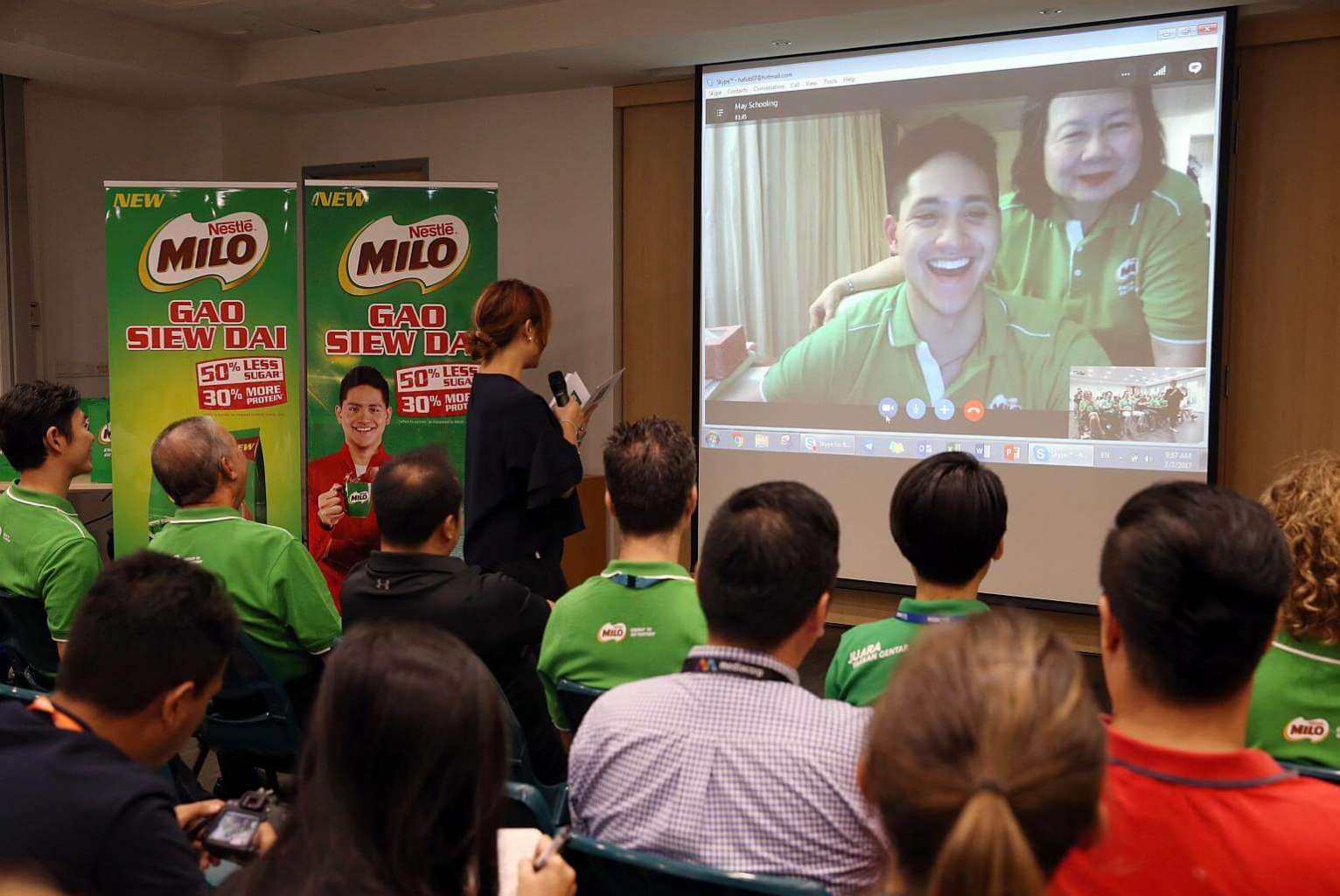 Joseph Schooling and his mother May speak to guests and the media in a Skype session from Texas.