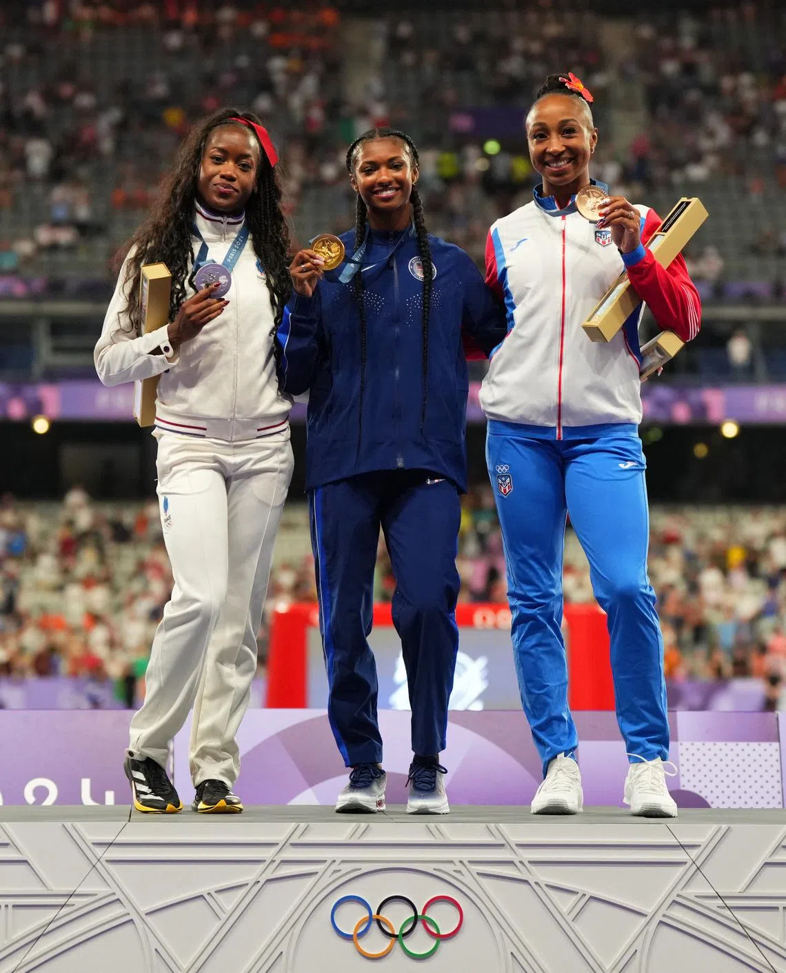 (From left) Silver medallist Cyrena Samba-Mayela, gold medallist Masai Russell and bronze medallist Jasmine Camacho-Quinn.
