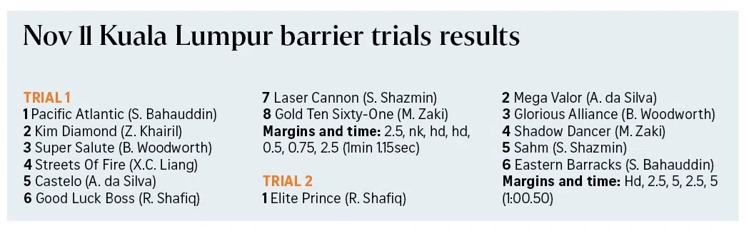 Last-start winner Pacific Atlantic (Bahauddin Sharudin) finishing the best in the first barrier trial at Sungai Besi on Nov 11. The six-year-old galloper will contest the Singapore Pools Trophy (1,200m) in Ipoh on Nov 16.