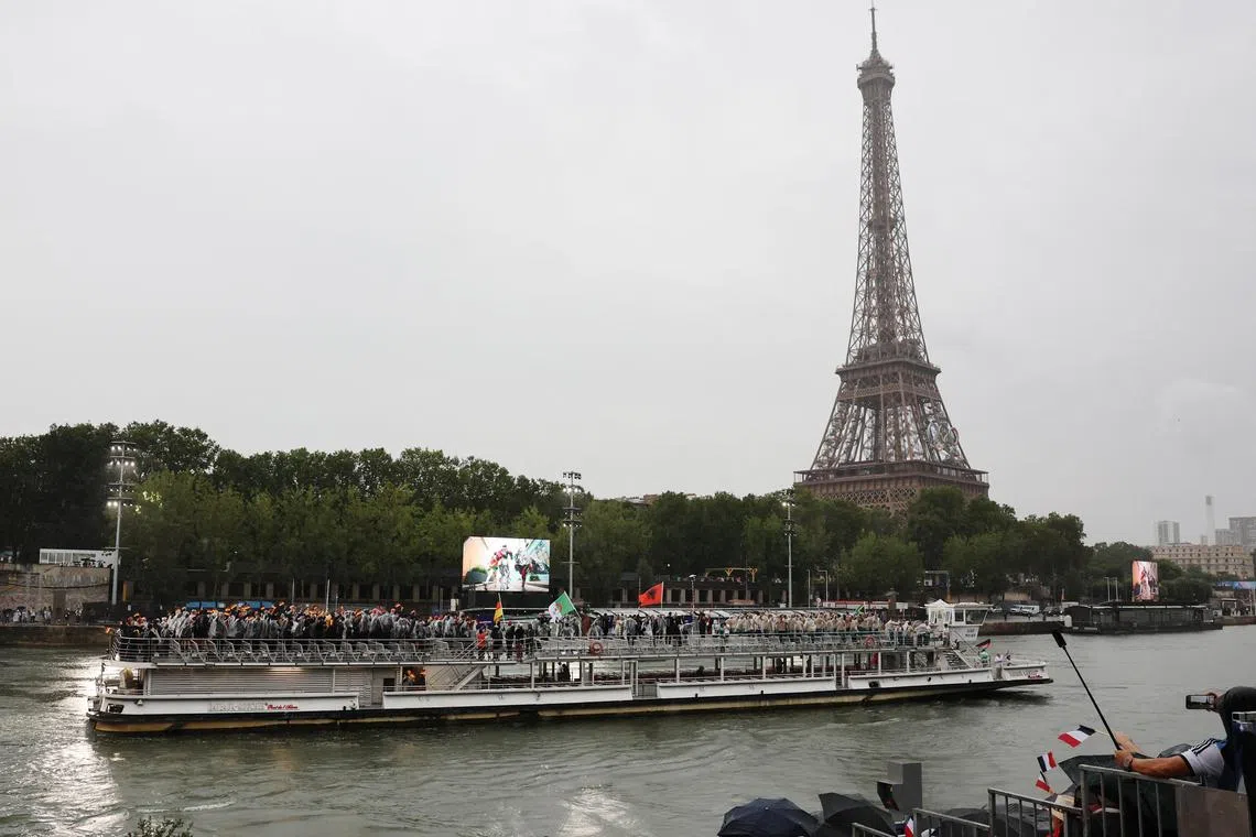 Athletes of Germany, Algeria, Albania and Afghanistan pass Paris’ Eiffel Tower aboard a boat, in the Olympics opening ceremony.
